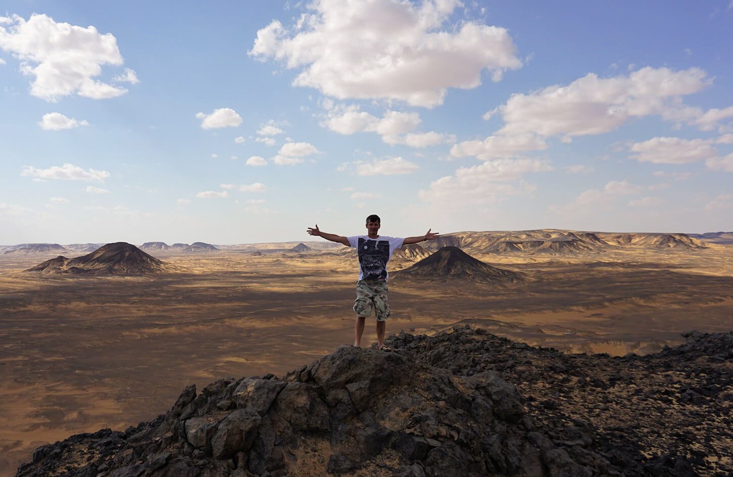 극적인 검은 화산암 형성이 황금빛 모래 언덕과 뚜렷하게 대조를 이루는 검은 사막에 감탄하세요. 이러한 자연 조각들 사이를 걸으며 수백만 년에 걸쳐 그것들을 만든 자연의 힘을 상상해 보세요.