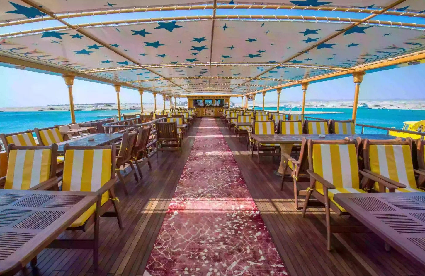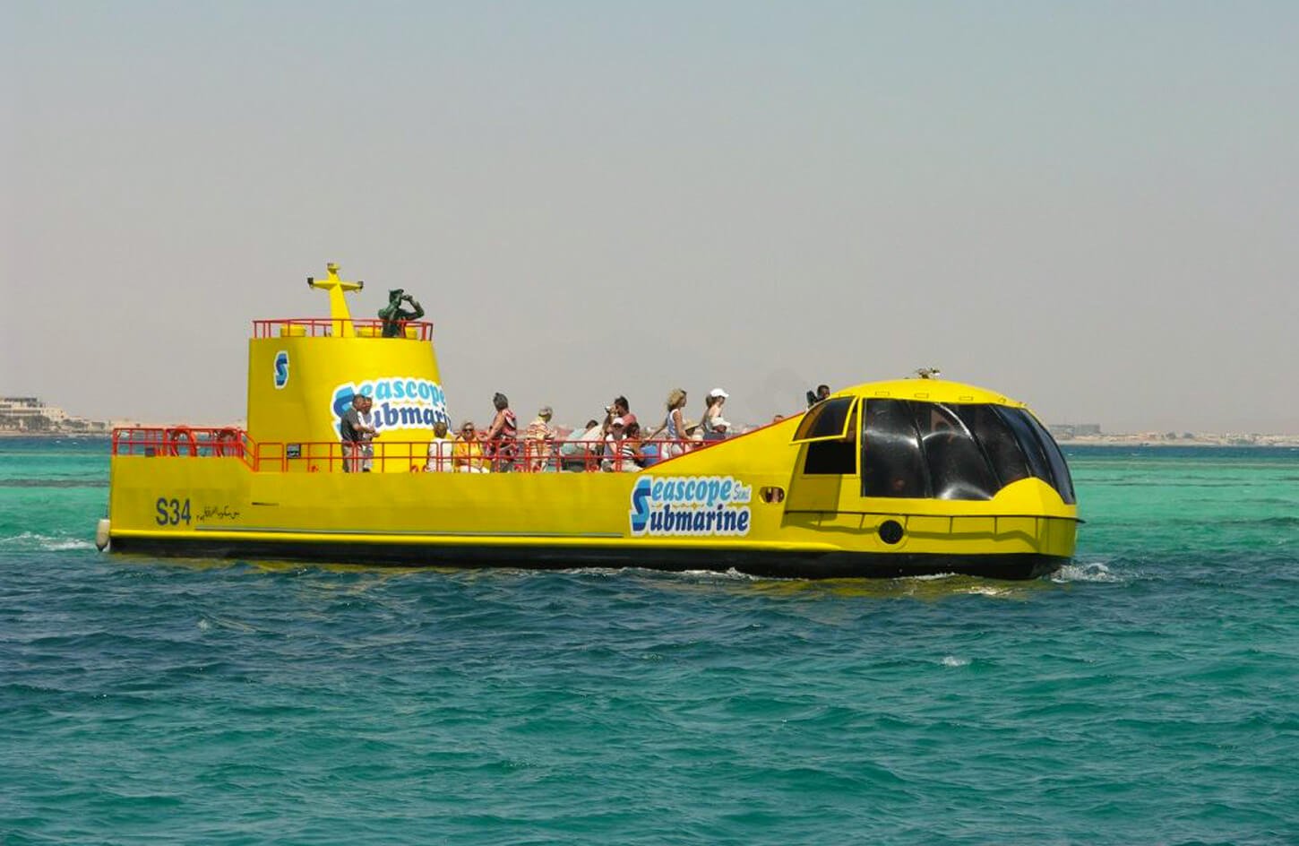 짧은 크루즈(약 15~30분) 후, 생동감 넘치는 산호초 지역에 도착하면 에어컨이 설치된 수중 관측 데크로 내려가 대형 창을 통해 홍해의 해양 생물의 파노라마 뷰를 즐길 수 있습니다.